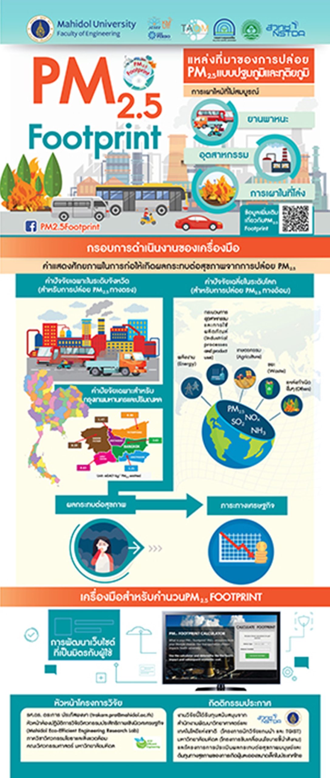 โดยโครงการที่เราทำขึ้นนี้จะเป็นการสร้างนวัตกรรม “PM2.5 Footprint Calculator” หรือ การคำนวณผลกระทบต่อสุขภาพจากฝุ่น PM2.5 ตามหลักการของแนวคิดริเริ่มวัฏจักรชีวิตภายใต้โครงการสิ่งแวดล้อมแห่งสหประชาชาติ ร่วมกับ สมาคมพิษวิทยาสิ่งแวดล้อมและเคมี (UNEP/SETAC life cycle initiative) ซึ่งเป็นหนึ่งในองค์กรระดับโลก ที่จัดตั้งขึ้นเพื่อสำรวจและประเมินแนวโน้ม ที่มีผลกระทบต่อสภาพแวดล้อม โดยเฟสแรกจะจัดทำเป็นเว็บไซต์ และขยายผลจัดทำเป็นแอปพลิเคชัน ซึ่งนับเป็นครั้งแรกในเอเชีย
