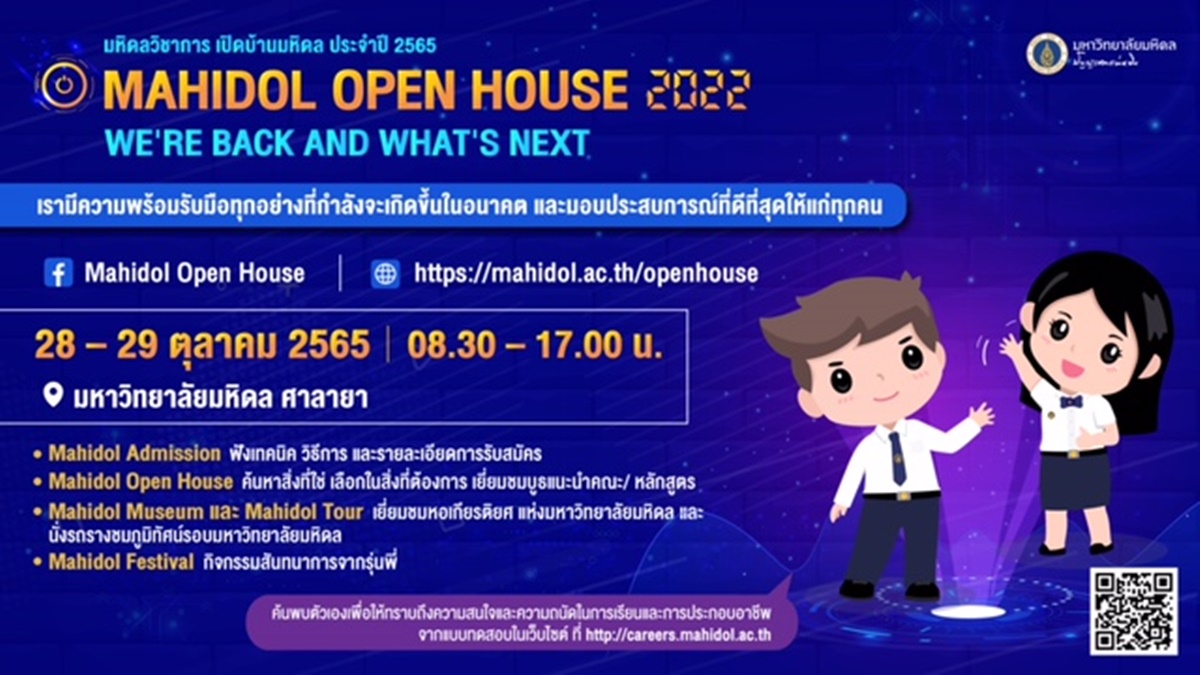 โดยสามารถเข้าเยี่ยมชมงานมหิดลวิชาการ เปิดบ้านมหิดลประจำปีการศึกษา 2565 ระหว่างวันที่ 28 – 29 ตุลาคม 2565 ภายใต้แนวคิดหลัก “WE’RE BACK AND WHAT’S NEXT” ทั้ง Onsite (แสดงผล ATK) และ Online