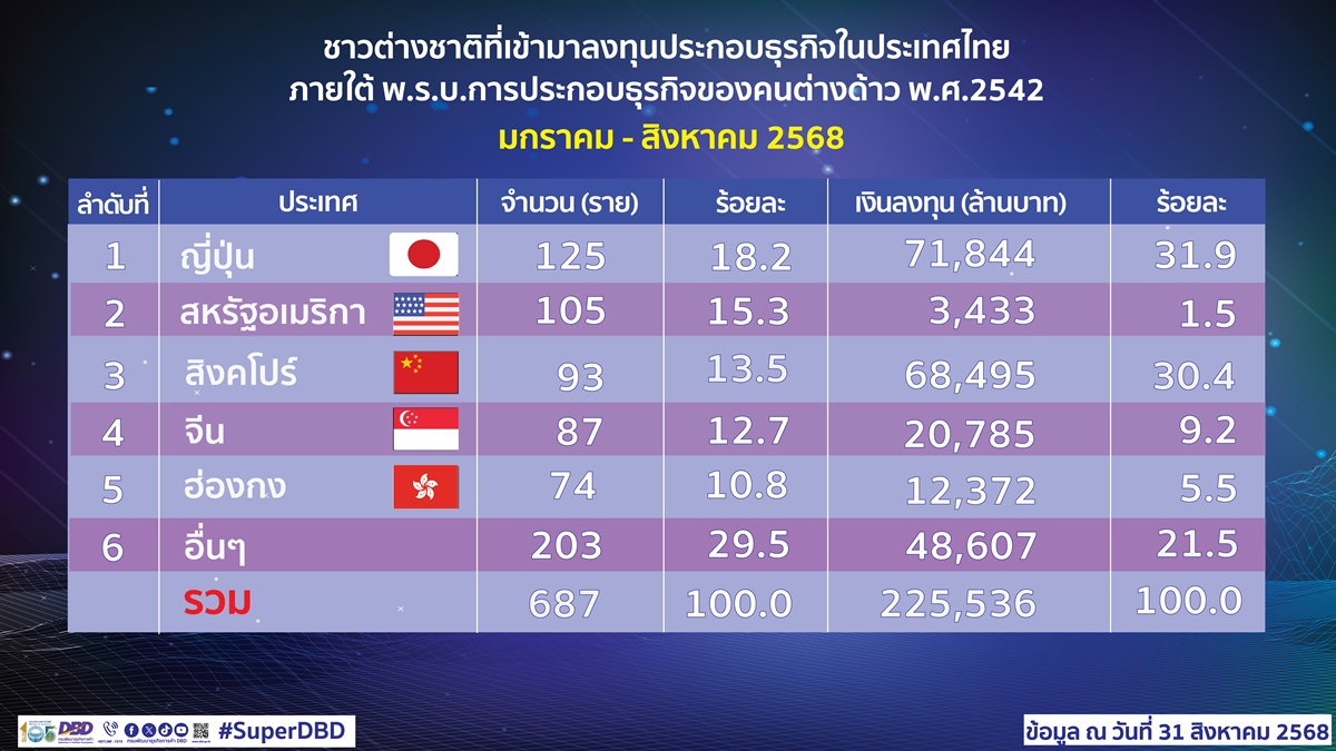 สิงหาคม ‘68 ต่างชาติลงทุนในไทยกว่า 6.6 หมื่นล้านบาท